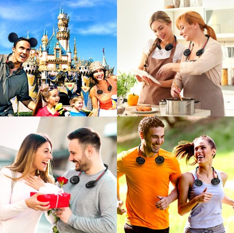 our necklace cooling fan allows you to do whatever you want and enjoy cool breeze while working in the office or exercising in the gym, doing outdoor sports activities, like camping, hiking, climbing, beach etc. Great for traveling.